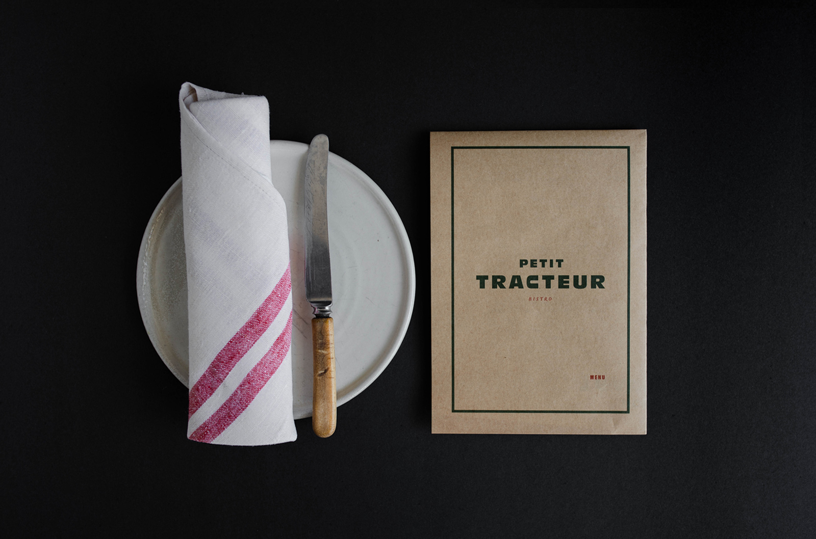 Petit Tracteur is Ten Minutes by Tractor’s bistro and bar offering french inspired food matched with a selection of world class wines. Part of the brief was to draw inspiration from an old story about a local man called ‘Simon the Frenchman’. Working with the talented illustrator Adam Nickel, Simon was brought to life and features alongside the wordmark as a part of the identity system. Considering the interiors and cuisine the brand has all the hallmarks of an authentic french bistro with a provincial twist.
